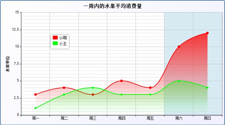 | [Chart:Area&Areaspline]??????2014-02-19 14:27:45by ??? 如下图是小明和小王一周内的水果平均消费量,考虑以下几个重点: