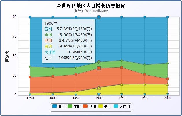 <a:chart bindTarget="ds" type="area"> <a:title text="全世界各地区人口增长历史概况"/> <a:subtitle text="来源:Wikipedia.org"/> <a:xAxis> <a:xAxi name="period" tickmarkPlacement="on"/> </a:xAxis> <a:yAxis> <a:yAxi name="asia,africa,europe,america,oceania"> <a:title text="百分比"/> </a:yAxi> </a:yAxis> <a:tooltip formatter="formatter3" shared="true" useHTML="true"/> <a:plotOptions> <a:area lineColor="#666666" lineWidth="1" stacking="percent"> <a:marker lineColor="#666666" lineWidth="1"/> </a:area> </a:plotOptions> </a:chart> Demo Attachments |