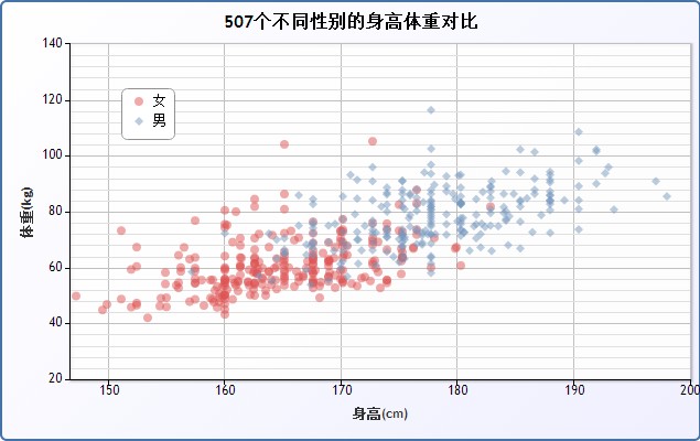<a:chart bindTarget="ds" groupBy="sex" type="scatter" zoomType="xy" > <a:title text="507个不同性别的身高体重对比"/> <a:subTitle text="来源: Heinz 2003"/> <a:xAxis> <a:xAxi name="height" startOfTick="true" endOnTick="true" showLastLabel="true" > <a:title text="身高(cm)"/> </a:xAxi> </a:xAxis> <a:yAxis> <a:yAxi name="weight"> <a:title text="体重(kg)"/> </a:yAxi> </a:yAxis> <a:legend layout="vertical" align="left" verticalAlign="top" x="100" y="70" floating="true" backgroundColor="#FFF" borderWidth="1" /> <a:plotOptions> <a:scatter> <a:marker radius="5"> <a:states> <a:hover enabled="true" lineColor="rgb(100,100,100)"/> </a:states> </a:marker> <a:states> <a:hover> <a:marker enabled="false"/> </a:hover> </a:states> <a:tooltip headerFormat="<b>{series.name}</b><br>" pointFormat="{point.x} cm, {point.y} kg" /> </a:scatter> </a:plotOptions> <a:seriesList> <a:seriesItem name="男" color="rgba(119, 152, 191, .5)"/> <a:seriesItem name="女" color="rgba(223, 83, 83, .5)"/> </a:seriesList> </a:chart> Demo Attachments |