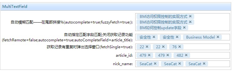 | [Reference] MultiTextField2014-04-25 14:43:09by ??? MultiTextField是一个提供文本多条输入以及能够通过自动查询选取记录,普遍应用于类似邮件收件人输入和选择,继承自TextField组件,拥有TextField标签的属性以及TextField对象的方法和事件。 上图是MultiTextField组件在页面中的呈现,输入框前的文字信息是通过MultiTextField标签属性prompt来定义的。 在screen文件中我们通过<a:multiTextField>标签来定义一个MultiTextField对象。 <a:dataSet id="ds" autoCreate="true"> <a:fields> <a:field name="article_title" autoComplete="true" fuzzyFetch="true" autocompleteservice="demo.doc_article_lov" prompt="自动模糊匹配——在尾部拼接%(autocomplete=true;fuzzyFetch=true;)"> <a:mapping> <a:map from="article_id" to="article_id"/> <a:map from="article_title" to="article_title"/> <a:map from="category_name" to="category_name"/> <a:map from="category_id" to="category_id"/> <a:map from="nick_name" to="nick_name"/> </a:mapping> </a:field> <a:field name="category_name" autoComplete="true" autoCompleteField="article_title" fetchRemote="false" autocompleteservice="demo.doc_article_lov" lovWidth="485" prompt="自动指定匹配字段匹配;关闭获取记录功能(fetchRemote=false;autocomplete=true;autoCompleteField=article_title)"> <a:mapping> <a:map from="article_id" to="article_id"/> <a:map from="article_title" to="article_title"/> <a:map from="category_name" to="category_name"/> <a:map from="category_id" to="category_id"/> <a:map from="nick_name" to="nick_name"/> </a:mapping> </a:field> <a:field name="category_id" fetchSingle="true" autocompleteservice="demo.doc_article_lov" prompt="获取记录有重复时弹出选择窗口(fetchSingle=true)"> <a:mapping> <a:map from="article_id" to="article_id"/> <a:map from="article_title" to="article_title"/> <a:map from="category_name" to="category_name"/> <a:map from="category_id" to="category_id"/> <a:map from="nick_name" to="nick_name"/> </a:mapping> </a:field> </a:fields> </a:dataSet> <a:form column="1" labelWidth="300" style="margin:10px;" title="MultiTextField"> <a:multiTextField name="article_title" bindTarget="ds" width="300"> <a:multiTextField name="category_name" bindTarget="ds" width="300"/> <a:multiTextField name="category_id" bindTarget="ds" width="300"/> <a:multiTextField name="article_id" bindTarget="ds" width="300" prompt="article_id" /> <a:multiTextField name="nick_name" bindTarget="ds" width="300" prompt="nick_name"/> </a:form> multiTextField标签可以设置一个id属性,id是组件的唯一标识,我们可以在页面脚本中用$('id')的方法获得该id对应的组件对象,进而可以调用相应的函数方法。 multiTextField标签的bindTarget属性可指定一个dataset对象的id,name属性可指定该dataset其中一个field的名字。这两个属性必须联合使用,其功能是将multiTextField对象绑定到dataset中的一个field上,进而我们只要对dataset进行操作就能即时反映在multiTextField上,另外multiTextField上的文字编辑也会立刻修改dataset中的数据。 如上代码,field标签是multiTextField所绑定的dataset中的一条字段(field),autocompleteservice属性可指定自动查询的BM。注意:以上属性均可定义在multiTextField标签上,效果相同,但是建议定义在field标签上。 field标签下的mapping标签定义了自动查询出的选项集的字段和主窗口的字段的联系关系,每条map标签都有from和to属性,from是自动查询出的选项的字段,to是multiTextField绑定的dataset中的字段。 Demo Attachments |