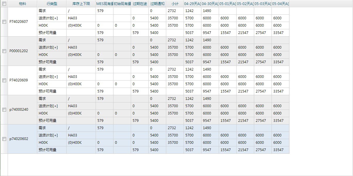 | [Grid] ???2014-05-21 15:48:35by ??? grid可以对相同数据的单元格进行行合并。 在需要分组的列上指定属性group="true" 列分组会导致记录顺序的重新分组排序,因此,建议数据在数据库端预先作groupby处理 <a:dataSets> <a:dataSet id="ds" selectable="true"> <a:datas> <a:record f1="P74020607" f2="需求" f3="/" f4="579" f5="" f6="" f7="0" f8="2732" f9="1242" f10="1490" f11="" f12="" f13="" f14=""/> <a:record f1="P74020607" f2="送货计划[+]" f3="HA03" f4="" f5="" f6="0" f7="5400" f8="35700" f9="5700" f10="6000" f11="6000" f12="6000" f13="6000" f14="6000"/> <a:record f1="P74020607" f2="H00K" f3="(0)H00K" f4="0" f5="0" f6="0" f7="5400" f8="35700" f9="5700" f10="6000" f11="6000" f12="6000" f13="6000" f14="6000"/> <a:record f1="P74020607" f2="预计可用量" f3="" f4="579" f5="" f6="579" f7="5400" f8="" f9="5037" f10="9547" f11="15547" f12="21547" f13="27547" f14="33547"/> <a:record f1="P00001202" f2="需求" f3="/" f4="579" f5="" f6="" f7="0" f8="2732" f9="1242" f10="1490" f11="" f12="" f13="" f14=""/> <a:record f1="P00001202" f2="送货计划[+]" f3="HA03" f4="" f5="" f6="0" f7="5400" f8="35700" f9="5700" f10="6000" f11="6000" f12="6000" f13="6000" f14="6000"/> <a:record f1="P00001202" f2="H00K" f3="(0)H00K" f4="0" f5="0" f6="0" f7="5400" f8="35700" f9="5700" f10="6000" f11="6000" f12="6000" f13="6000" f14="6000"/> <a:record f1="P00001202" f2="预计可用量" f3="" f4="579" f5="" f6="579" f7="5400" f8="" f9="5037" f10="9547" f11="15547" f12="21547" f13="27547" f14="33547"/> <a:record f1="P74020609" f2="需求" f3="/" f4="579" f5="" f6="" f7="0" f8="2732" f9="1242" f10="1490" f11="" f12="" f13="" f14=""/> <a:record f1="P74020609" f2="送货计划[+]" f3="HA03" f4="" f5="" f6="0" f7="5400" f8="35700" f9="5700" f10="6000" f11="6000" f12="6000" f13="6000" f14="6000"/> <a:record f1="P74020609" f2="H00K" f3="(0)H00K" f4="0" f5="0" f6="0" f7="5400" f8="35700" f9="5700" f10="6000" f11="6000" f12="6000" f13="6000" f14="6000"/> <a:record f1="P74020609" f2="预计可用量" f3="" f4="579" f5="" f6="579" f7="5400" f8="" f9="5037" f10="9547" f11="15547" f12="21547" f13="27547" f14="33547"/> <a:record f1="p74000240" f2="需求" f3="/" f4="579" f5="" f6="" f7="0" f8="2732" f9="1242" f10="1490" f11="" f12="" f13="" f14=""/> <a:record f1="p74000240" f2="送货计划[+]" f3="HA03" f4="" f5="" f6="0" f7="5400" f8="35700" f9="5700" f10="6000" f11="6000" f12="6000" f13="6000" f14="6000"/> <a:record f1="p74000240" f2="H00K" f3="(0)H00K" f4="0" f5="0" f6="0" f7="5400" f8="35700" f9="5700" f10="6000" f11="6000" f12="6000" f13="6000" f14="6000"/> <a:record f1="p74000240" f2="预计可用量" f3="" f4="579" f5="" f6="579" f7="5400" f8="" f9="5037" f10="9547" f11="15547" f12="21547" f13="27547" f14="33547"/> <a:record f1="p74020602" f2="需求" f3="/" f4="579" f5="" f6="" f7="0" f8="2732" f9="1242" f10="1490" f11="" f12="" f13="" f14=""/> <a:record f1="p74020602" f2="送货计划[+]" f3="HA03" f4="" f5="" f6="0" f7="5400" f8="35700" f9="5700" f10="6000" f11="6000" f12="6000" f13="6000" f14="6000"/> <a:record f1="p74020602" f2="H00K" f3="(0)H00K" f4="0" f5="0" f6="0" f7="5400" f8="35700" f9="5700" f10="6000" f11="6000" f12="6000" f13="6000" f14="6000"/> <a:record f1="p74020602" f2="预计可用量" f3="" f4="579" f5="" f6="579" f7="5400" f8="" f9="5037" f10="9547" f11="15547" f12="21547" f13="27547" f14="33547"/> </a:datas> <a:fields> <a:field name="f1" prompt="物料" /> <a:field name="f2" prompt="行类型" /> <a:field name="f3" prompt="库存上下限" /> <a:field name="f4" prompt="MES现有量" /> <a:field name="f5" prompt="初始现有量" /> <a:field name="f6" prompt="过期在途" /> <a:field name="f7" prompt="过期通知" /> <a:field name="f8" prompt="小计" /> <a:field name="f9" prompt="04-29天A[二]" /> <a:field name="f10" prompt="04-30天A[三]" /> <a:field name="f11" prompt="05-01天A[四]" /> <a:field name="f12" prompt="05-02天A[五]" /> <a:field name="f13" prompt="05-03天A[六]" /> <a:field name="f14" prompt="05-04天A[日]" /> </a:fields> </a:dataSet> </a:dataSets> <a:grid id="demo" bindTarget="ds" height="600" width="1200"> <a:columns> <a:column name="f1" group="true" /> <a:column name="f2"/> <a:column name="f3"/> <a:column name="f4" width="60" /> <a:column name="f5" width="60" /> <a:column name="f6" width="60" /> <a:column name="f7" width="60" /> <a:column name="f8" width="60" /> <a:column name="f9" width="60" /> <a:column name="f10" width="60" /> <a:column name="f11" width="60" /> <a:column name="f12" width="60" /> <a:column name="f13" width="60" /> <a:column name="f14" width="60" /> </a:columns> </a:grid> Demo Attachments |