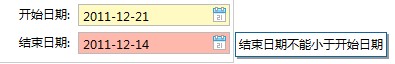 | [DataSet] ?????2011-12-28 12:00:57by ???? 验证器校验可以完成页面上大多数自定义校验,比如:校验结束日期是否大于开始日期,密码长度是否足够。 页面上的显示效果为:未检验通过的字段显示红色,鼠标悬浮,提示为通过的原因。如下图检验结束日期不能小于开始日期的效果 实现的方法,首先为dataSet的field字段设置属性validator="yyy",然后再javascript代码中,定义yyy函数。该函数接受3个参数,和2种返回值 第1个是当前记录record。 第2个是当前记录中的当前列name。 第3个参数是当前的值value。 第1种返回值为true,表示验证成功 第2种返回值为验证不通过的原因 这样每次页面上当前值改变时,都会触发定义的yyy函数,进行校验,如果校验成功则返回true,页面上没有任何提示。如果校验未通过,则返回未通过的原因,并且当前值变为红色。 下面的代码用验证器校验了结束日期不能小于开始日期