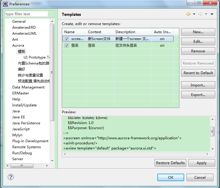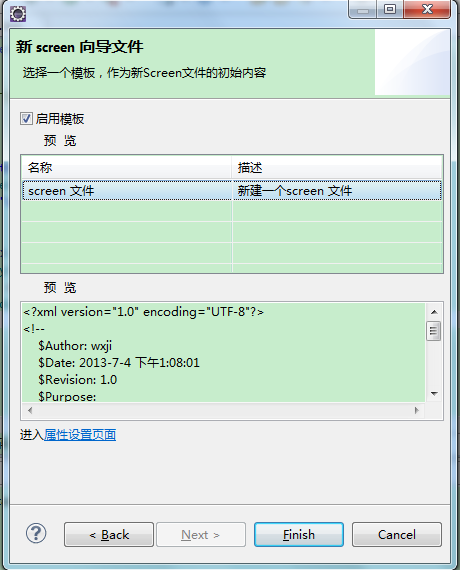 | Aurora IDE:????2013-06-17 15:31:57by wxjivm Table of Contents Aurora新建向导可以创建源码文件和原型工程。 填写生成路径和文件名。 选择Screen模板,作为源文件的初始内容,模板内容可通过属性设置页面修改。 不启用或者没有选择模板,将创建一个空文件。 Demo Attachments |