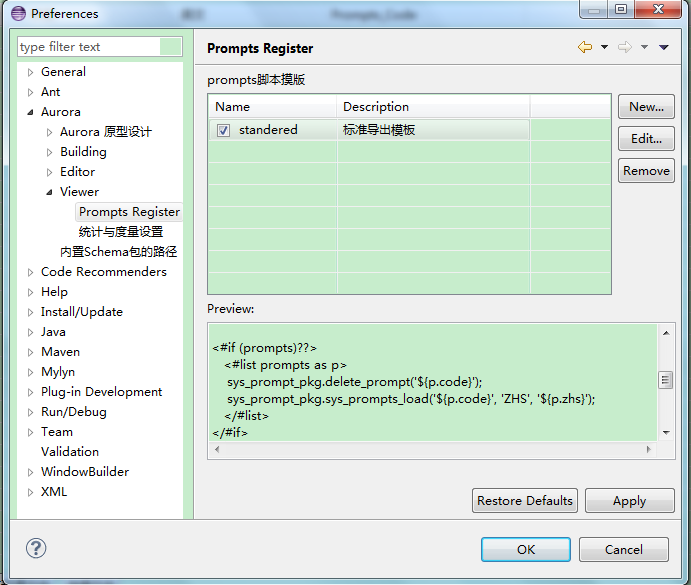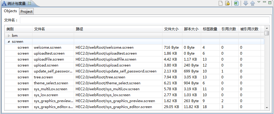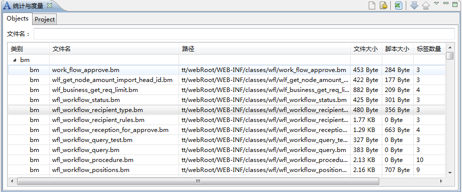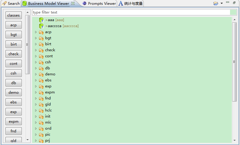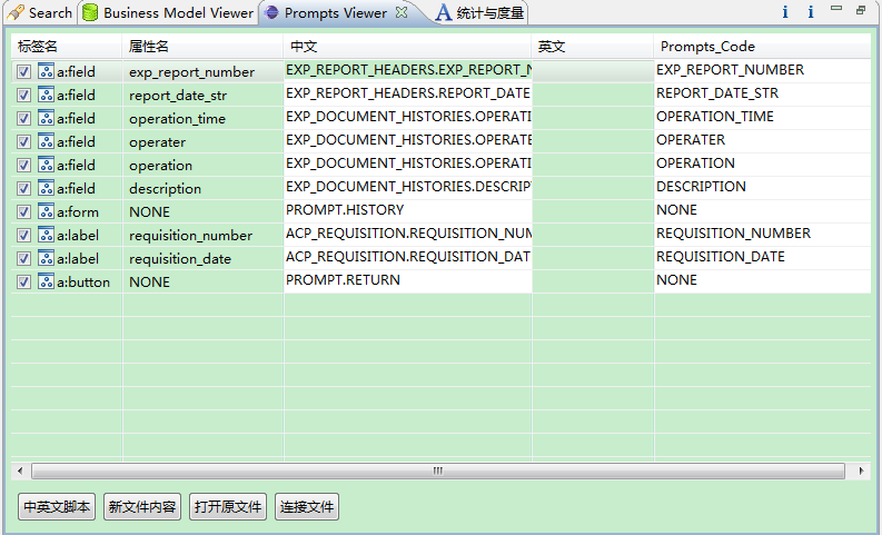 | Aurora IDE:??2013-06-21 13:02:49by wxjivm Table of Contents 使用该功能前需要先选择工程,之后左侧显示classes目录下所有文件夹,主视图显示左侧选中文件夹下的全部BM文件(包括子文件夹)。 1.查看Aurora工程的BM文件。 2.双击BM文件名可以打开BM编辑器。 3.拖动BM文件至Screen文件,可自动创建Form或Grid组件。 选择生成组件:Prompts视图用于查看、修改源文件字段的Prompt,并导出Sql注册脚本。 ●连接文件:选择要维护Prompts的文件。 ●打开原文件:打开文件源码。 ●新文件内容:生成新的文件。 ●中英文脚本:生成注册脚本。 统计视图用于统计Aurora工程各个文件的标签数量,脚本大小,文件大小和引用次数等,并且可以将结果存入数据库或从数据库读出,也可以导出到Excel。 统计视图如下,工具栏按钮依次为:选择文件、选择工程,导出到Excel,读取数据库保存结果和将结果保存到数据库。 1.统计之前需要选择文件或者选择一个Aurora工程。 选择将要统计的文件: 选择将要统计的Aurora工程: 选择完文件后程序开始统计,统计结果分为单个文件统计明细和所有文件汇总。 文件统计明细: ●统计结果显示文件名、路径、文件大小、脚本大小、标签数量、引用等。 ●在统计结果上方输入框输入文件名可以过滤统计结果,支持?(单个字符)和*(多字符)匹配符。 ●双击文件明细可以打开源码。 ●点击列头可以按升序或降序重新排列显示结果。 文件统计汇总: 汇总信息包括项目名称、资源库信息、所有文件统计值总和。 2.保存统计结果 将结果保存到数据库: “eclipse工程名”即Aurora项目名称,每个工程可以在数据库保存多次统计结果,以“项目名”区分。 3.读出数据库保存的结果 选择读取统计结果的Aurora项目。 选择项目。 读取统计结果如下图: Demo Attachments |